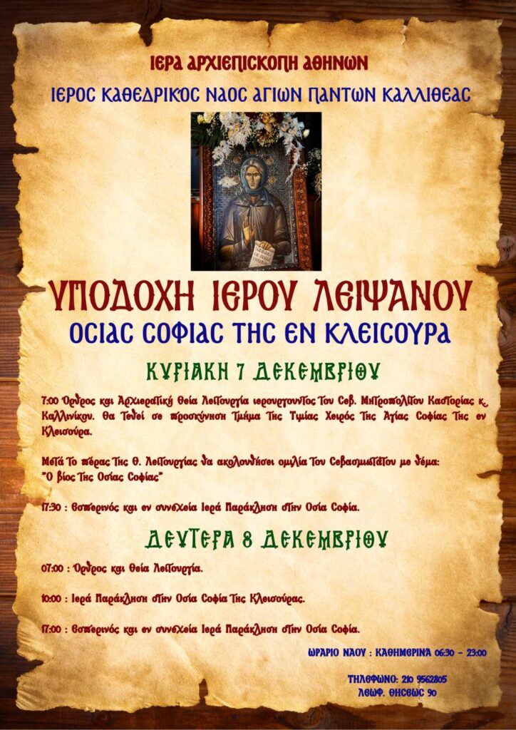 10:00 Ιερά Παράκληση στην Οσία Σοφία της Κλεισούρας.