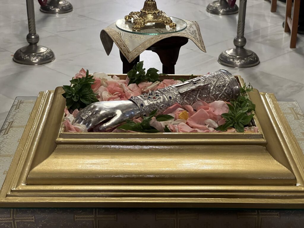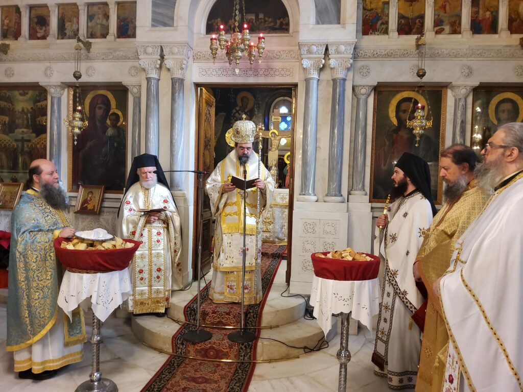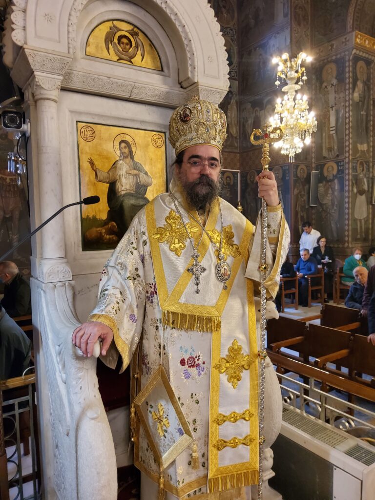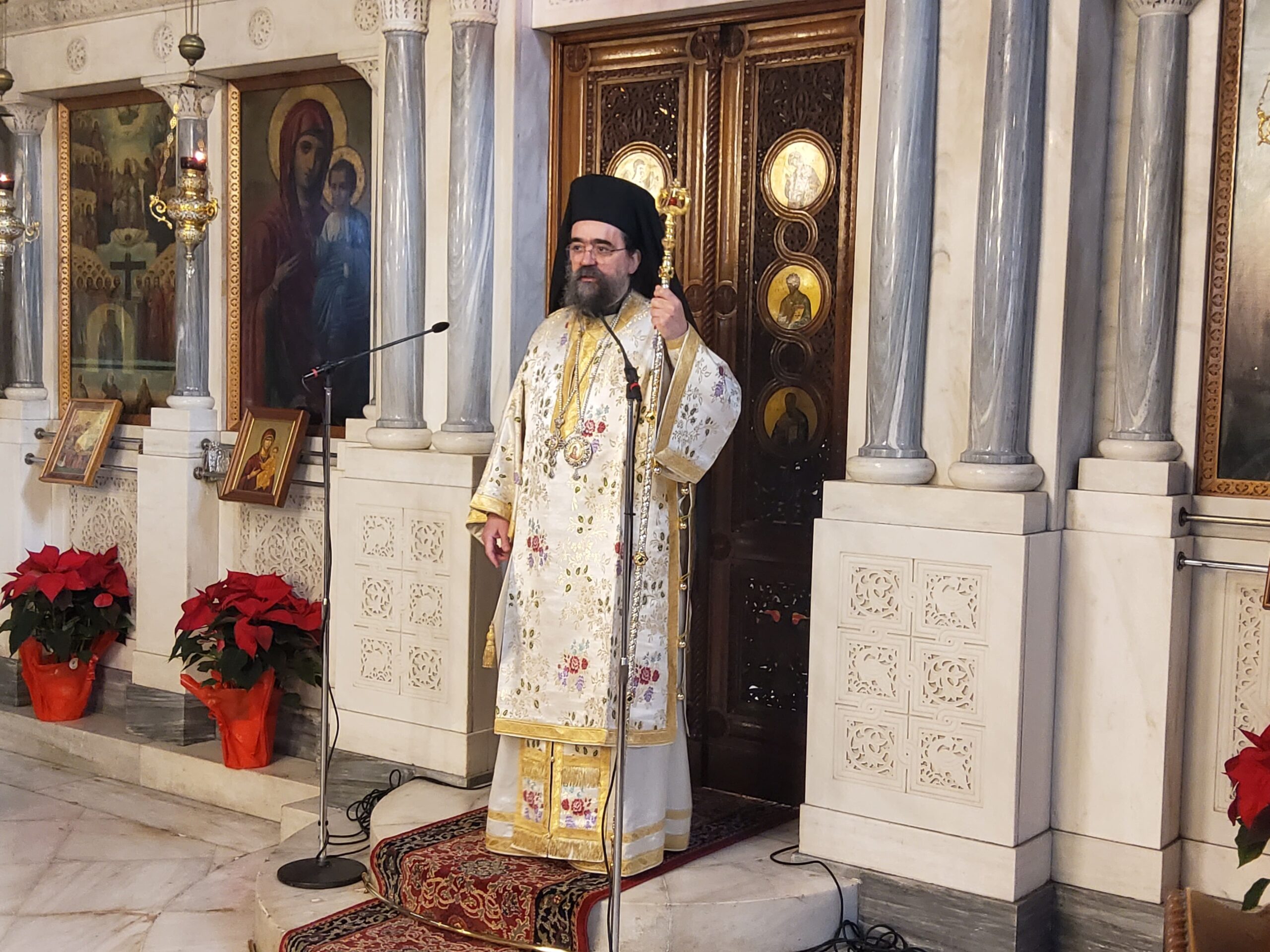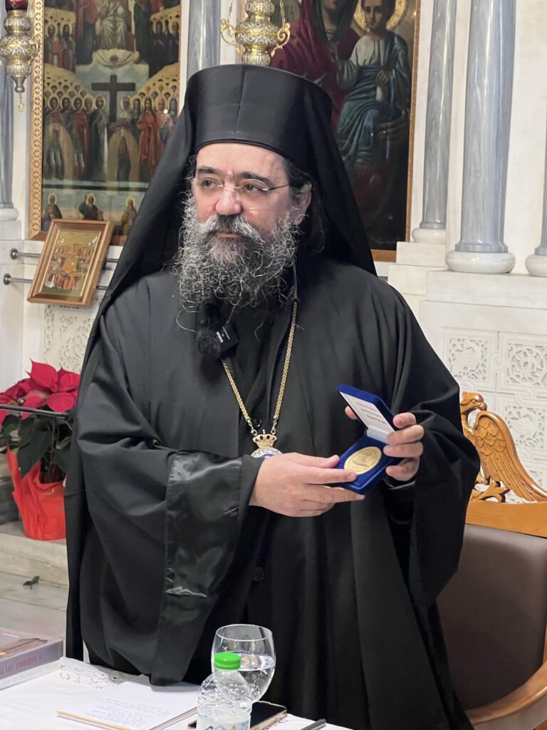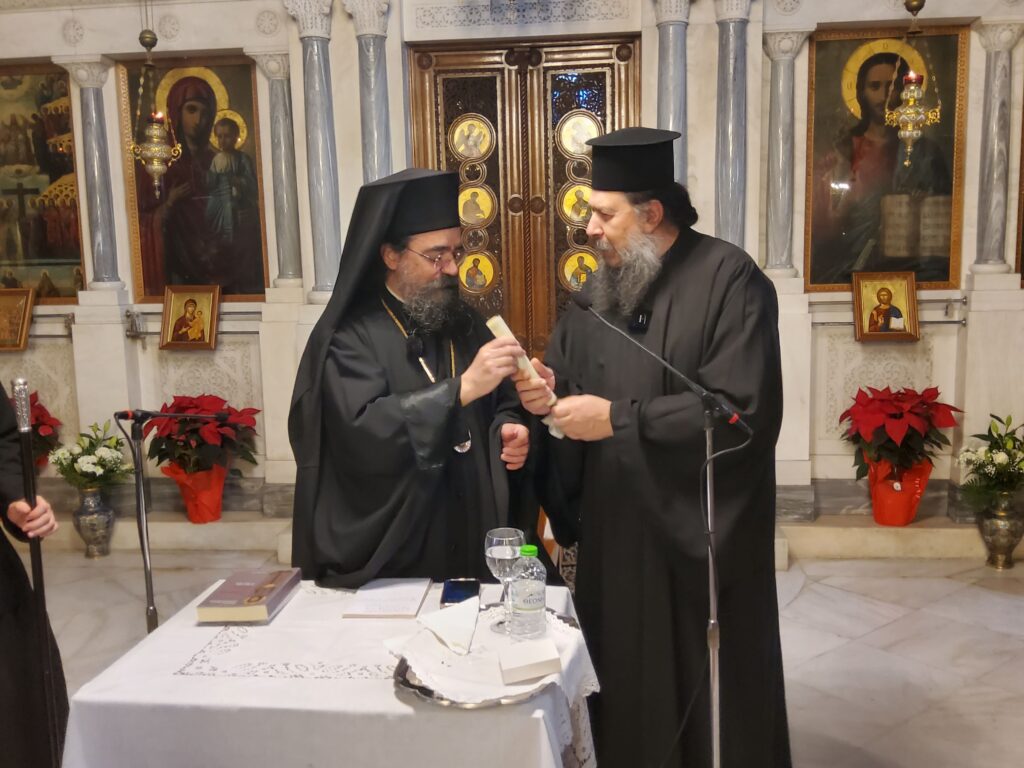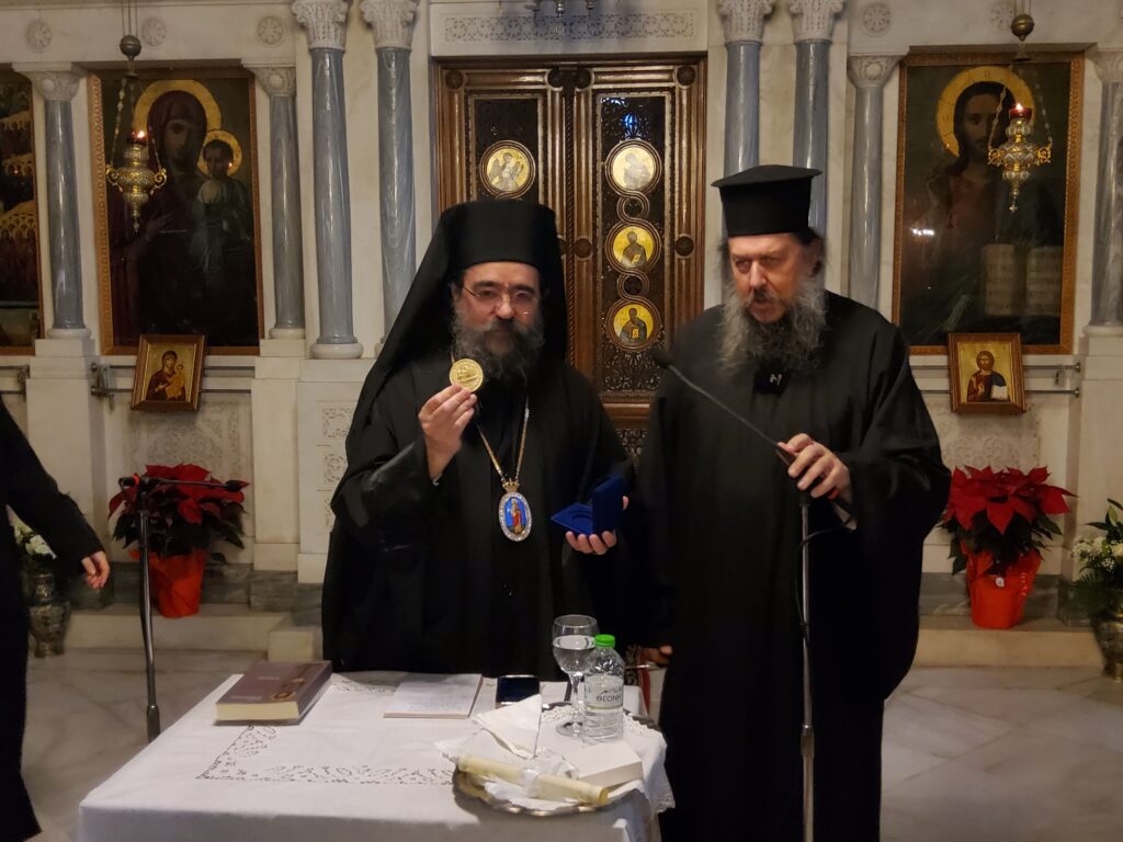 Η παράδοση του μεταλλίου των 100 χρόνων του Ναού στον Σεβασμιώτατο εκ μέρους των ιερέων, από τον πρωτοπρεσβύτερο Ανάργυρο Σιγάλα.