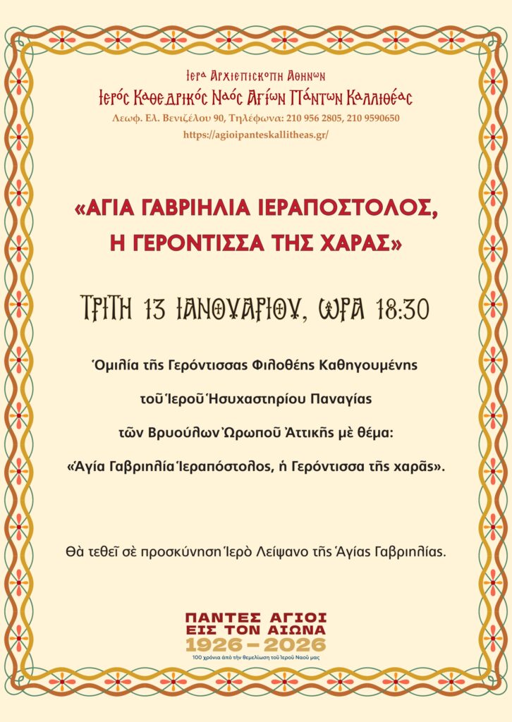 18:30 – Ομιλία της Γερόντισσας Φιλοθέης Καθηγουμένης του Ιερού Ησυχαστηρίου Παναγίας των Βρυούλων Ωροπού Αττικής με θέμα: