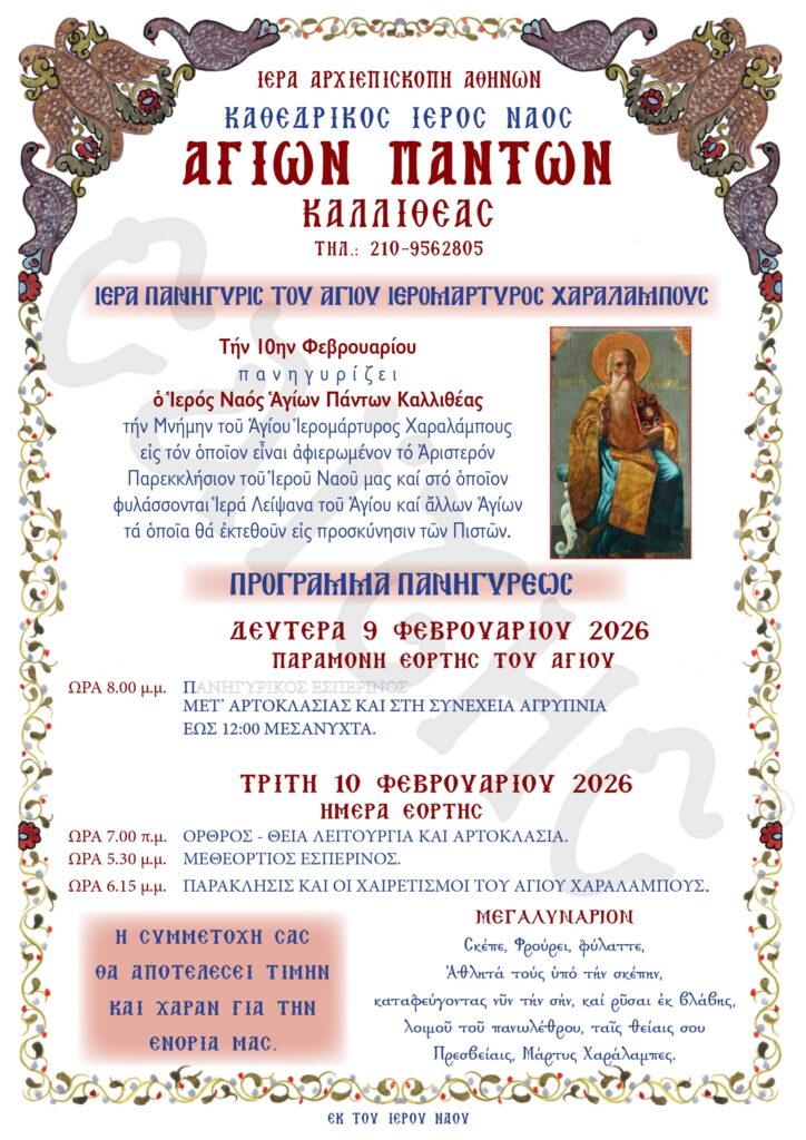 Την 10η Φεβρουαρίου πανηγυρίζει ο Ιερός Ναός Αγίων Πάντων Καλλιθέας την Μνήμη του Αγίου Ιερομάρτυρος Χαραλάμπους.
