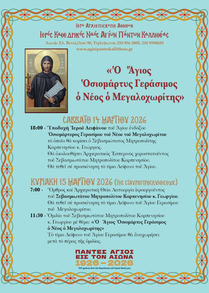Γεωργίου μὲ θέμα: «Ὁ Ἅγιος Ὁσιομάρτυς Γεράσιμος ὁ Νέος ὁ