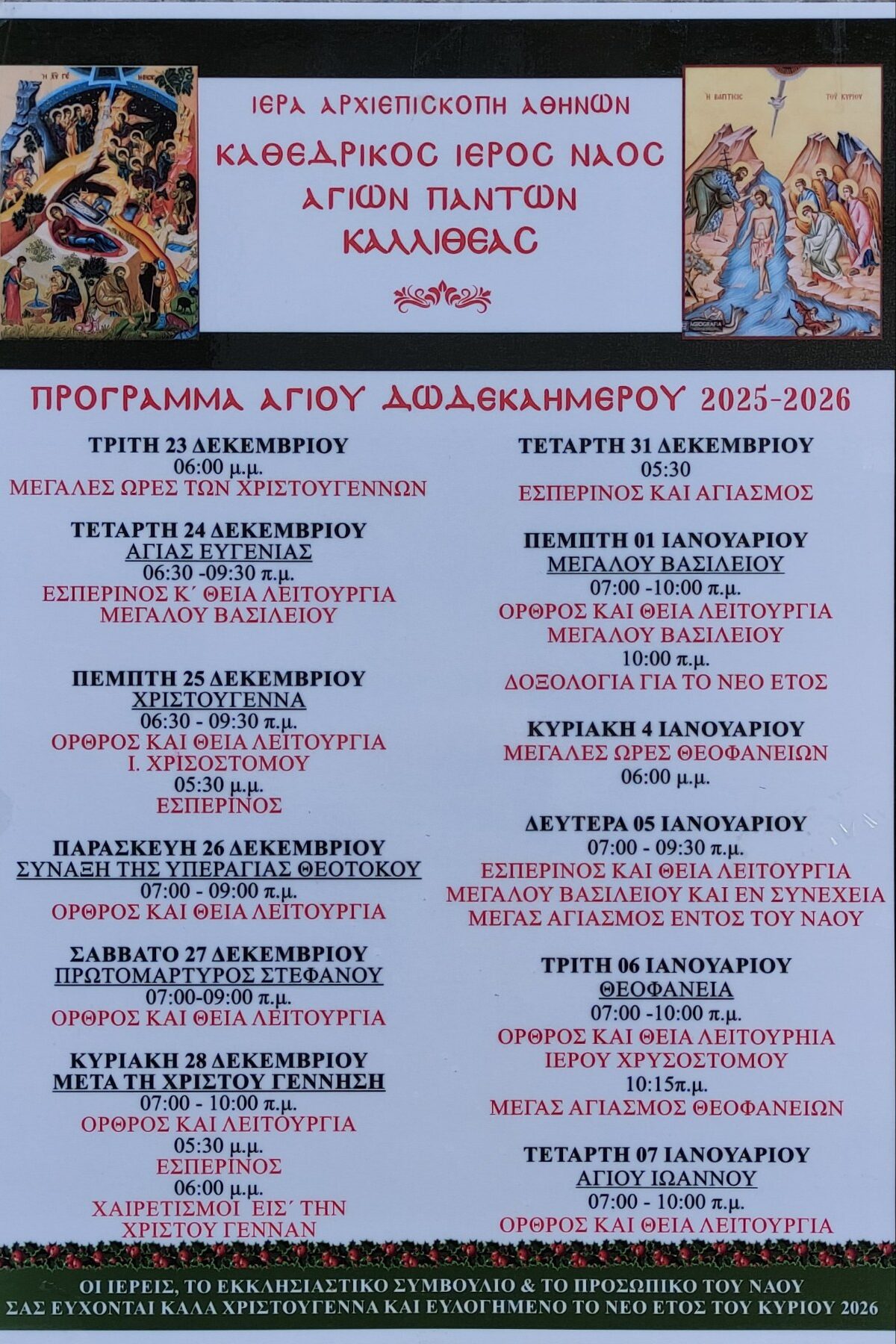 Πρόγραμμα 23 Δεκεμβρίου 2025 – 07 Ιανουαρίου 2026